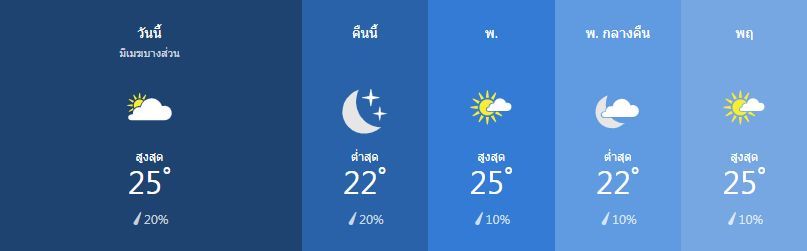 มีเมฆมากเป็นบางส่วน สูง 25เซลเซียส ความเร็วลม ตะวันออกเฉียงใต้ ที่ 15 ถึง 25 กิโลเมตรต่อชั่วโมง
