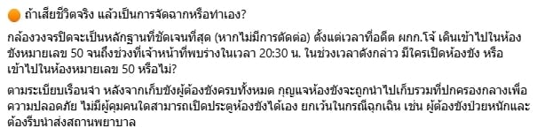 กล้องวงจรปิดจะเป็นหลักฐานที่ชัดเจนที่สุด (หากไม่มีการตัดต่อ) ตั้งแต่เวลาที่อดีต ผกก.โจ้ เดินเข้าไปในห้องขังหมายเลข 50 จนถึงช่วงที่เจ้าหน้าที่พบร่างในเวลา 20:30 น. ในช่วงเวลาดังกล่าว มีใครเปิดห้องขัง หรือเข้าไปในห้องหมายเลข 50 หรือไม่?
