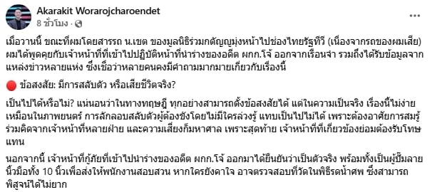 ล่าสุด เบนซ์ เรซซิ่ง ได้ออกมาเคลื่อนไหวถึงเหตุการณ์ดังกล่าวอีกครั้ง โดยรอบนี้เจ้าตัวเผยว่าได้รับข้อมูลอินไซต์สุด ๆ จากปากของเจ้าหน้าที่กู้ภัยที่เข้าไปรับร่างของ ผู้กำกับโจ้ ออกมาจากเรือนจำคลองเปรม ระบุว่า