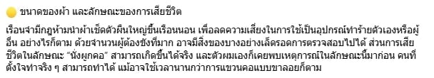 เรือนจำมีกฎห้ามนำผ้าเช็ดตัวผืนใหญ่ขึ้นเรือนนอน เพื่อลดความเสี่ยงในการใช้เป็นอุปกรณ์ทำร้ายตัวเองหรือผู้อื่น อย่างไรก็ตาม ด้วยจำนวนผู้ต้องขังที่มาก อาจมีสิ่งของบางอย่างเล็ดรอดการตรวจสอบไปได้ ส่วนการเสียชีวิตในลักษณะ “นั่งผูกคอ” สามารถเกิดขึ้นได้จริง และตัวผมเองก็เคยพบเหตุการณ์ในลักษณะนี้มาก่อน คนที่ตั้งใจทำจริง ๆ สามารถทำได้ แม้อาจใช้เวลานานกว่าการแขวนคอแบบขาลอยก็ตาม
