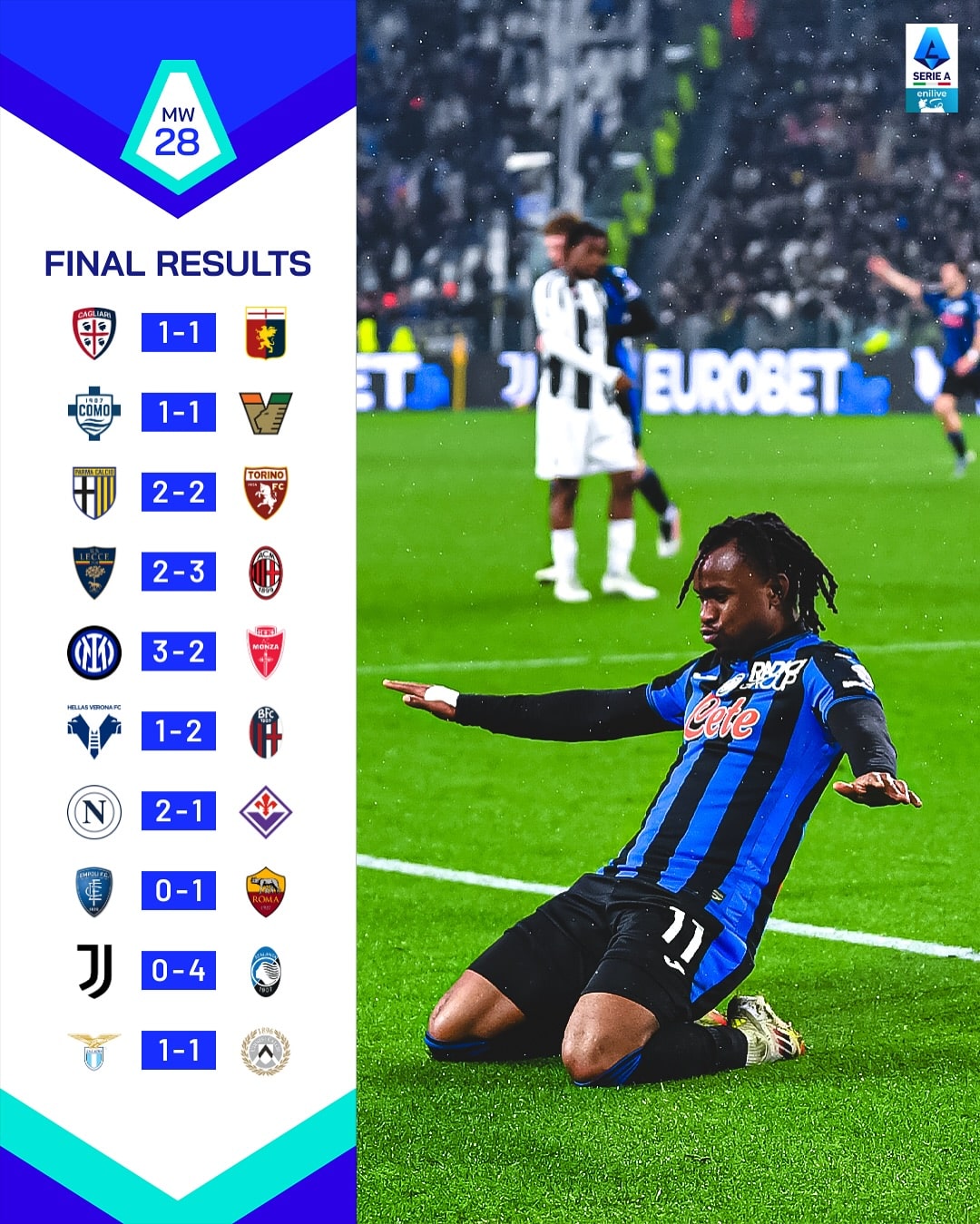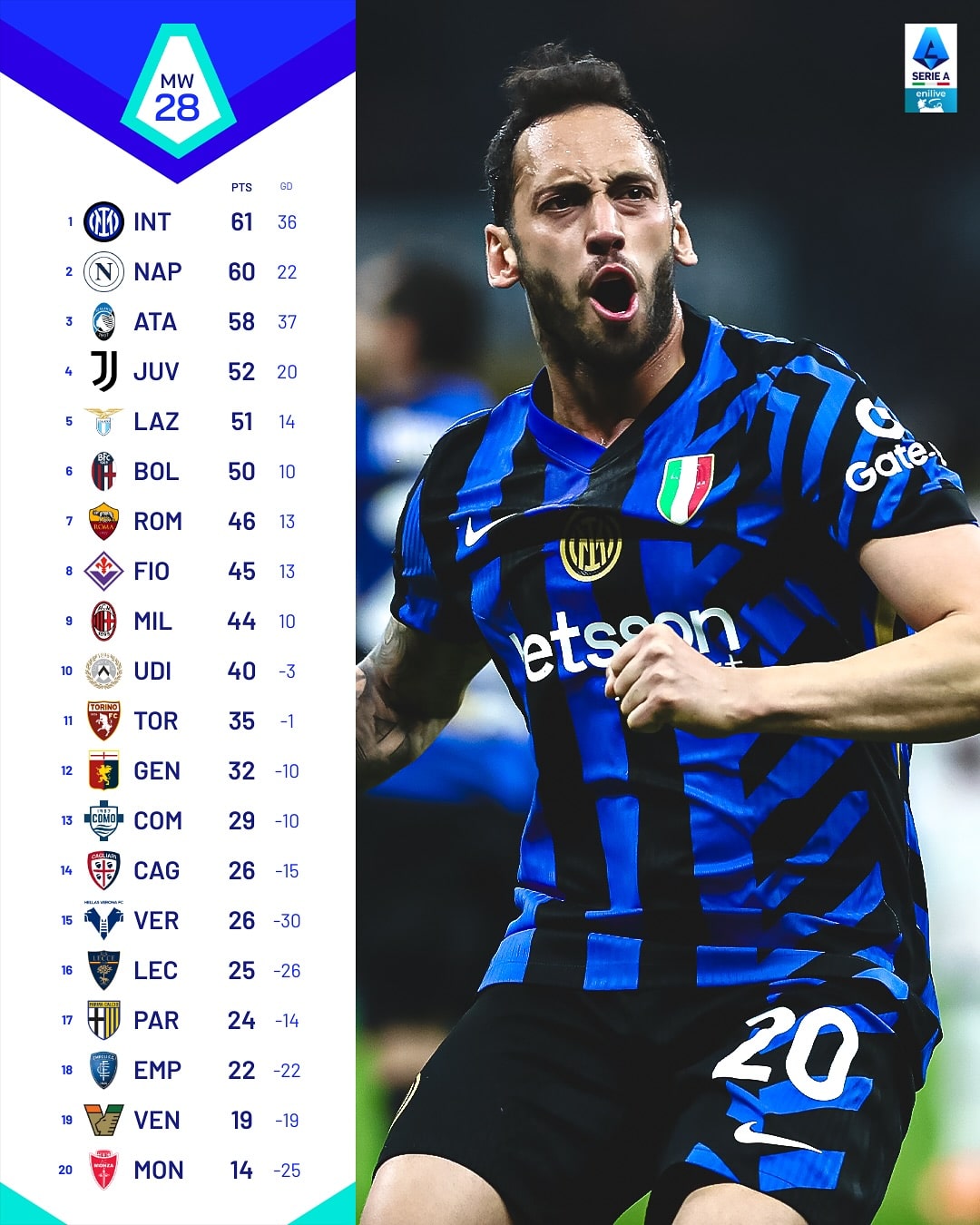สรุปผลการแข่งขัน กัลโช่ เซเรียอา 2024/25 หลังจบนัดที่ 28