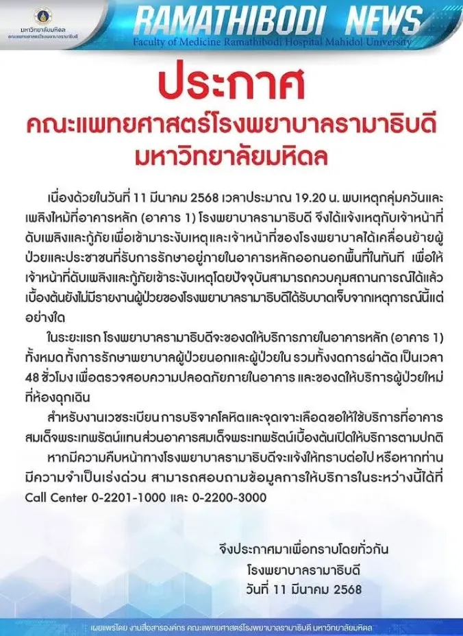 โรงพยาบาลรามาธิบดี ประกาศงดให้บริการอาคาร 1 เป็นระยะเวลา 48 ชั่วโมง หลังเกิดไฟไหม้ เบื้องต้นไม่มีรายงานผู้ได้รับบาดเจ็บ