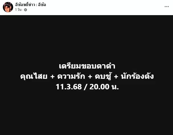 เมื่อไม่กี่วันก่อนหน้านี้เพจดังอย่าง อีซ้อขยี้ข่าว : อีซ้อ ออกมาเปิดประเด็นชวนกระตุกต่อมเผือกให้กับชาวเน็ตด้วยการทิ้งปริศนาให้ได้ลองทายกันเล่น ๆ โดยที่ยังไม่บอกรายละเอียดของเรื่องราวที่เกิดขึ้น มีแค่เพียงวันที่และเวลาปิดท้ายโพสต์นั้น ระบุว่า “เตรียมขอบตาดำ คุณไสย + ความรัก + คบชู้ + นักร้องดัง 11.3.68 / 20.00 น.” ซึ่งงานนี้นอกจากชาวโซเชียลจะมามุงกันแล้ว เพจชื่อดังทั้งหลายก็มารวมตัวกันที่ใต้โพสต์โดยไม่ได้นัดหมาย เพราะมีแต่คนอยากจะรู้เรื่องราวต่อจากนี้