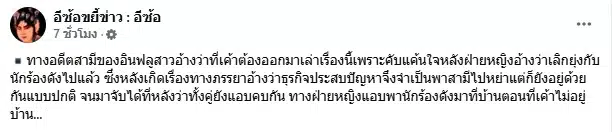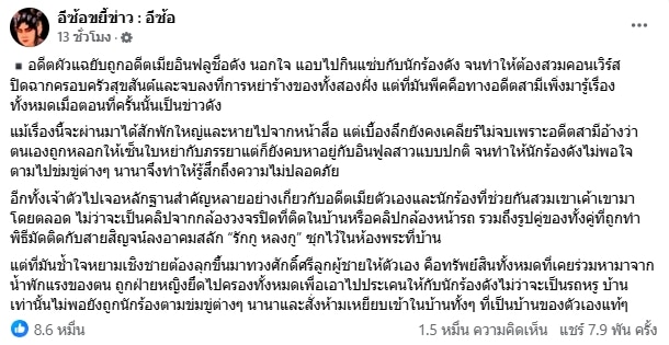 ล่าสุดช่วงกลางดึกที่ผ่านมา (11 มี.ค. 68) เพจอีซ้อขยี้ข่าว ก็มีความเคลื่อนไหวอีกครั้ง ซึ่งรอบนี้เป็นการเล่าเรื่องทั้งหมดจากปริศนาที่ทิ้งไว้ในโพสต์ก่อนหน้านี้ ระบุว่า “อดีตผัวแฉยับถูกอดีตเมียอินฟลูชื่อดัง นอกใจ แอบไปกินแซ่บกับนักร้องดัง จนทำให้ต้องสวมคอนเวิร์สปิดฉากครอบครัวสุขสันต์และจบลงที่การหย่าร้างของทั้งสองฝั่ง แต่ที่มันพีคคือทางอดีตสามีเพิ่งมารู้เรื่องทั้งหมดเมื่อตอนที่ครั้นนั้นเป็นข่าวดัง
