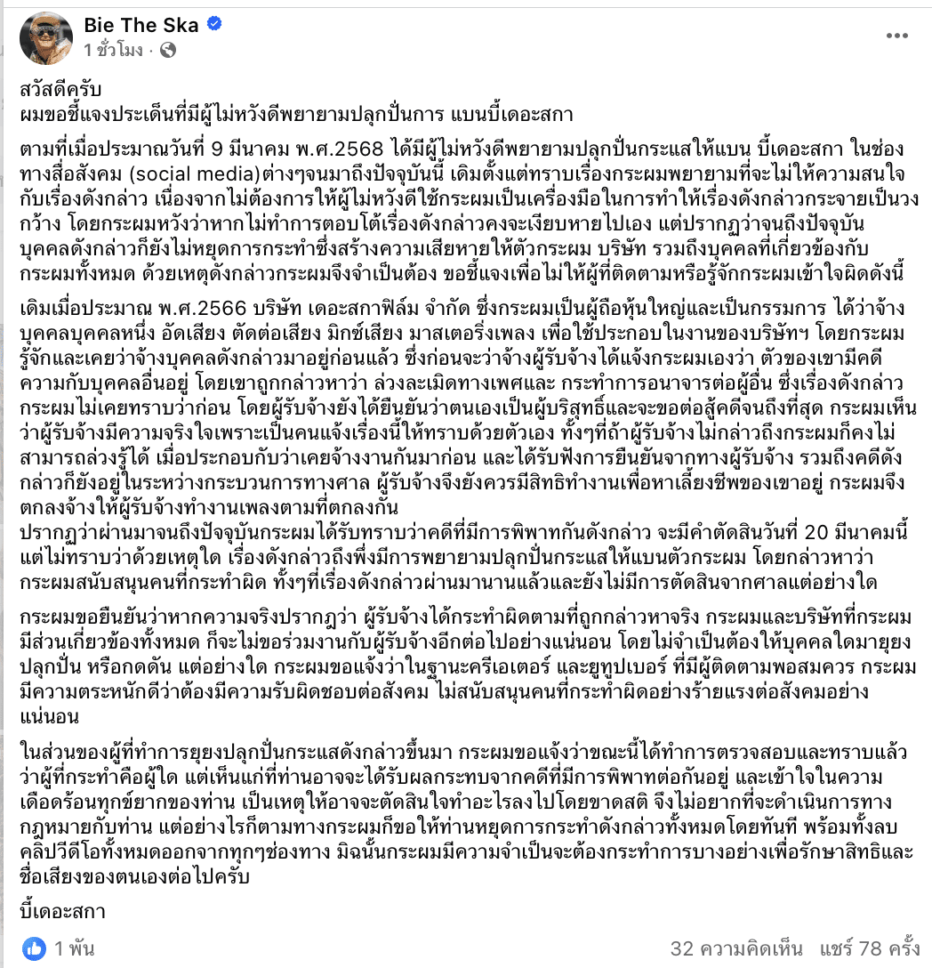 ตามที่เมื่อประมาณวันที่ 9 มีนาคม พ.ศ.2568 ได้มีผู้ไม่หวังดีพยายามปลุกปั่นกระแสให้แบน บี้เดอะสกา ในช่องทางสื่อสังคม (social media)ต่างๆจนมาถึงปัจจุบันนี้ เดิมตั้งแต่ทราบเรื่องกระผมพยายามที่จะไม่ให้ความสนใจกับเรื่องดังกล่าว เนื่องจากไม่ต้องการให้ผู้ไม่หวังดีใช้กระผมเป็นเครื่องมือในการทำให้เรื่องดังกล่าวกระจายเป็นวงกว้าง โดยกระผมหวังว่าหากไม่ทำการตอบโต้เรื่องดังกล่าวคงจะเงียบหายไปเอง แต่ปรากฏว่าจนถึงปัจจุบัน บุคคลดังกล่าวก็ยังไม่หยุดการกระทำซึ่งสร้างความเสียหายให้ตัวกระผม บริษัท รวมถึงบุคคลที่เกี่ยวข้องกับกระผมทั้งหมด ด้วยเหตุดังกล่าวกระผมจึงจำเป็นต้อง ขอชี้แจงเพื่อไม่ให้ผู้ที่ติดตามหรือรู้จักกระผมเข้าใจผิดดังนี้