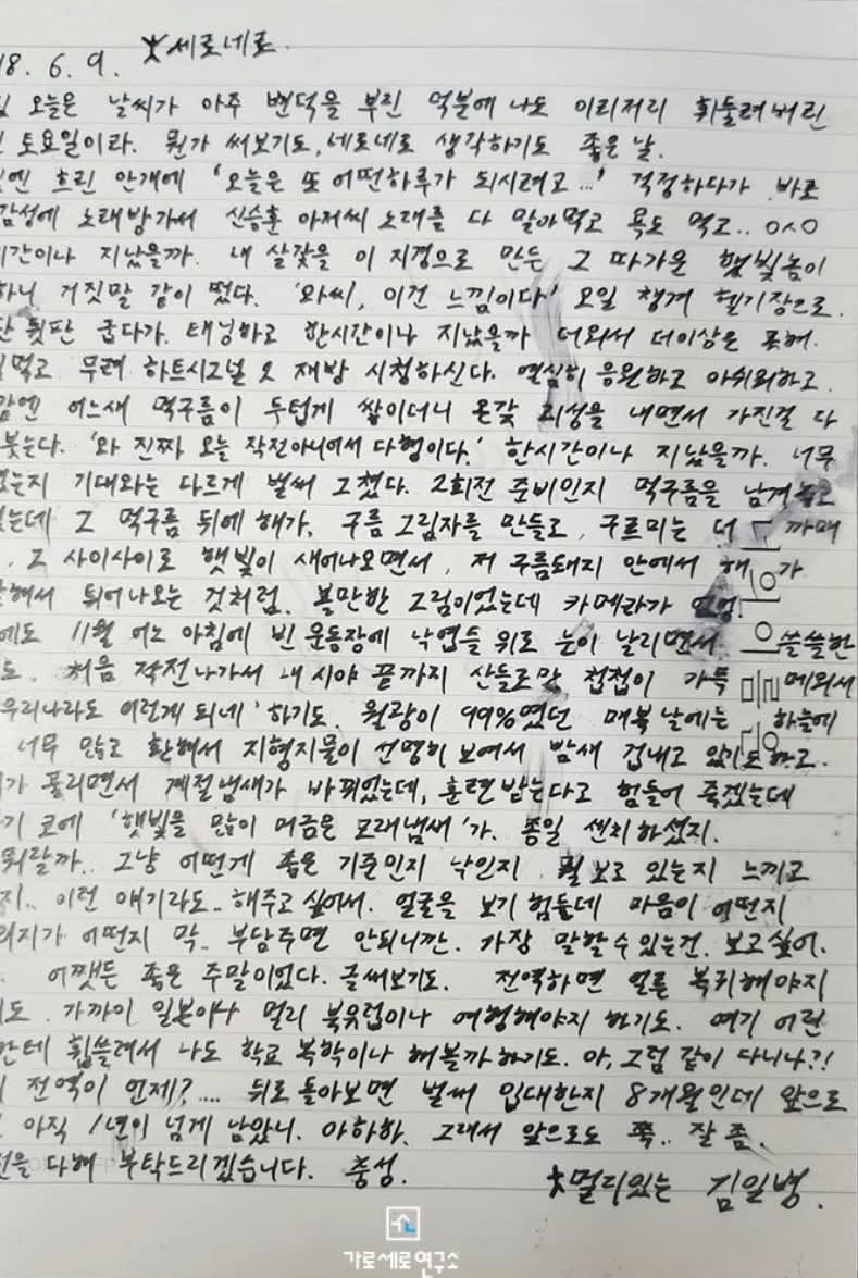 จดหมายเหล่านี้ถูกกล่าวหาว่าเขียนขึ้นในช่วงที่เขาอยู่ในกองทัพ ระบุวันที่ 9 มิถุนายน 2018 เขาลงท้ายจดหมายด้วย “จากพลทหารคิมที่อยู่ไกล” ส่วนหนึ่งของจดหมายยังแสดงให้เห็นว่าเขามักเรียกเธอว่า “แซโร-เนโร” ซึ่งดูเหมือนจะเป็นชื่อเล่นของคิมแซรน เช่นประโยคว่า ฉันรักเซโรเนโร” “เซโรเนโร ฉันรักเธอ”