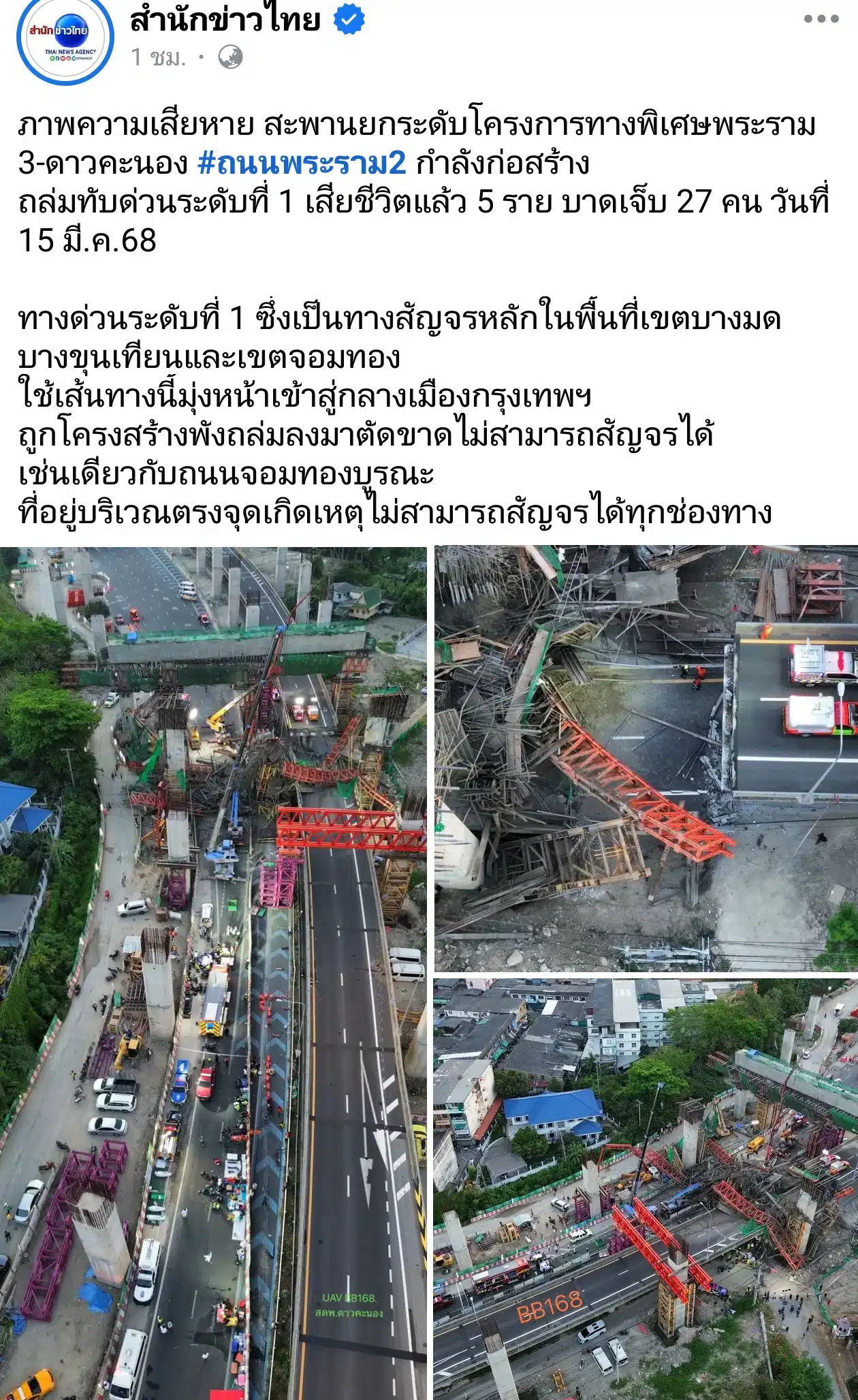 โศกนาฏกรรมซ้ำซาน คานสะพานทางด่วนพระราม 2 ถล่มกลางดึก เสียชีวิต 7 รายและบาดเจ็บจำนวนมากเกิดเหตุการณ์สะเทือนขวัญขึ้นอีกครั้งบนถนนพระราม 2 คานสะพานทางด่วนที่กำลังก่อสร้างได้เกิดการพังถล่มลงมาอย่างรุนแรงในช่วงกลางดึกของวันที่ 15 มีนาคม 2568 บริเวณบริเวณ ซอยพระรามที่ 2 ซอย 17 ถึง ซอย 25 ถนนพระรามที่ 2 แขวงบางมด เขตจอมทอง กรุงเทพฯ