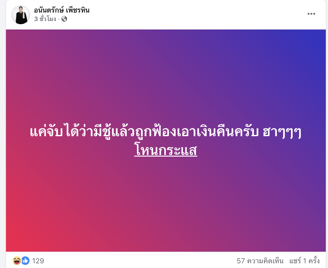 “แค่จับได้ว่ามีชู้แล้วถูกฟ้องเอาเงินคืนครับ ฮาๆๆๆ โหนกระแส” “เย็นนี้รู้เรื่องใครบงการ” “พ่อรายงานว่ามีใบสั่งเป็นของตัวเองแล้วนะ หรอยหลาวกรู #เป็นบุคคลตามใบสั่ง”