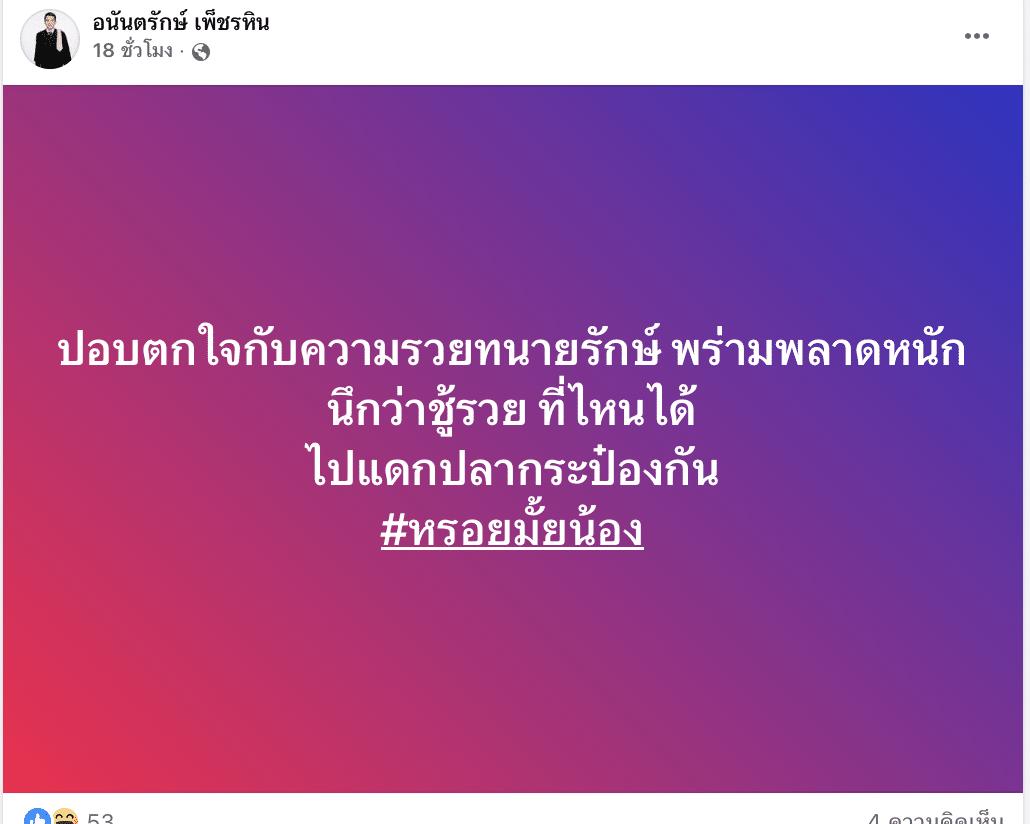 วันนี้ 17 มีนาคม 2568 ผู้สื่อข่าวรายงาน เฟซบุ๊ก ทนายรักษ์ อนันตรักษ์ เพ็ชรหิน ทนายดังภูเก็ต ได้โพสต์รูปภาพตนเองพร้อมข้อความว่า “ทนายรักษ์ขอบคุณทุกกำลังใจที่ส่งเข้ามา ผมพร้อมเข้าชี้แจงต่อสื่อมวลชนทุกสำนักใครแต่งเรื่องเท็จได้รู้กัน” พร้อมทั้งแท็กหาเพจเฟซบุ๊กรายการ โหนกระแส ทุบโต๊ะข่าว Amarin TV 34 และ โหดจัง จังหวัดภูเก็ต
