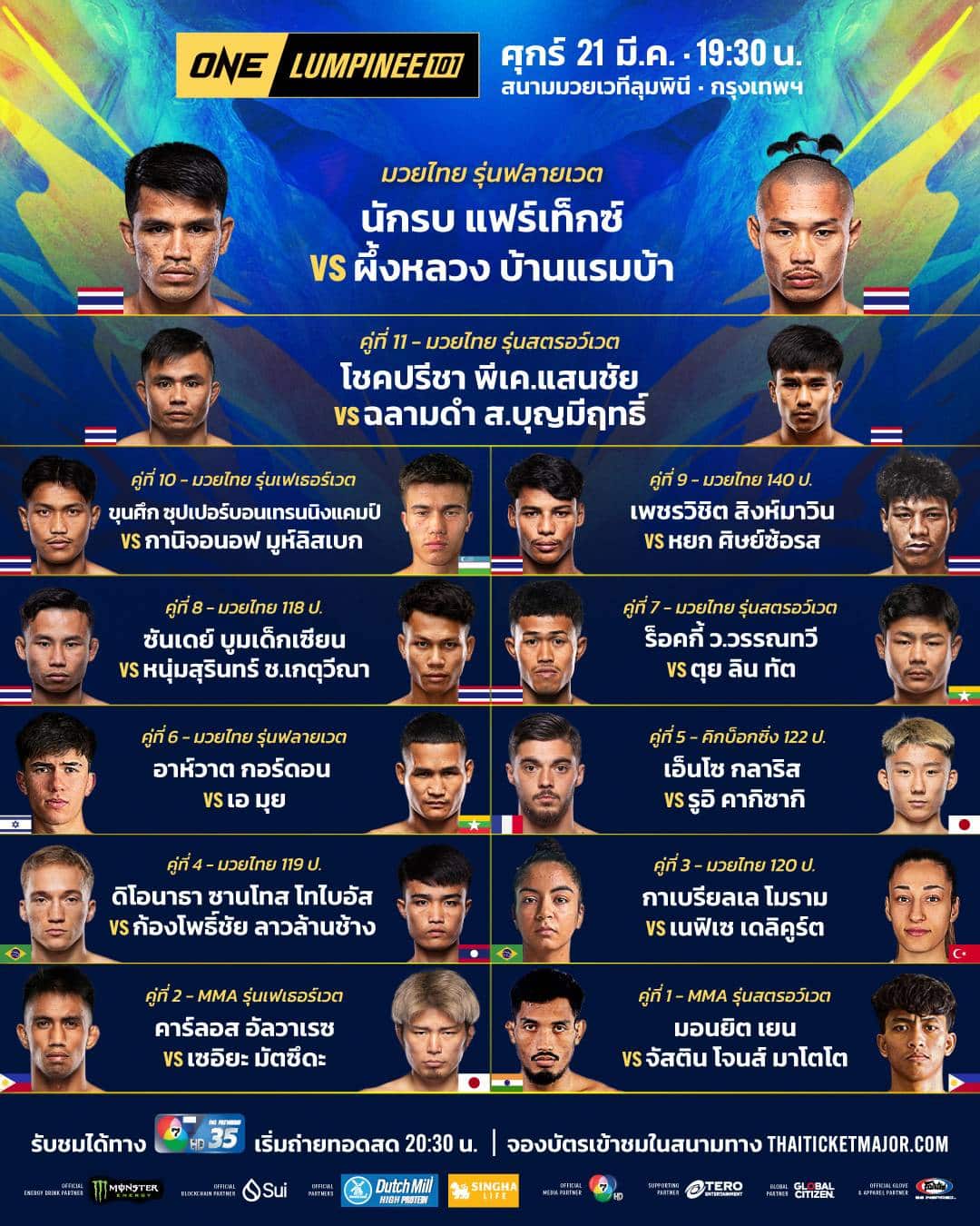 โปรแกรมการแข่งขันทุกคู่ศึก ONE ลุมพินี 101