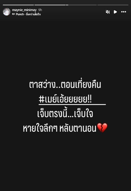 ล่าสุดช่วงกลางดึกที่ผ่านมา เมย์ วาสนา ก็ได้เคลื่อนไหวผ่านทางสตอรี่ไอจีส่วนตัวของเธออีกครั้ง โดยระบุเป็นข้อความว่า “ตาสว่าง..ตอนเที่ยงคืน #เมย์เอ้ยยยยย!! เจ็บตรงนี้…เจ็บใจ หายใจลึก ๆ หลับตานอน” พร้อมใส่เพลง ยิ่งกว่าเสียใจ ของพั้นช์ วรกาญจน์ ด้วย