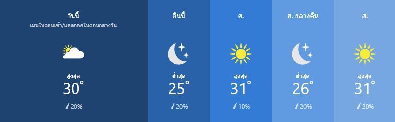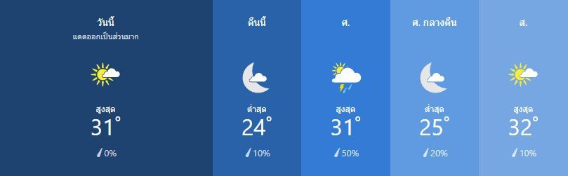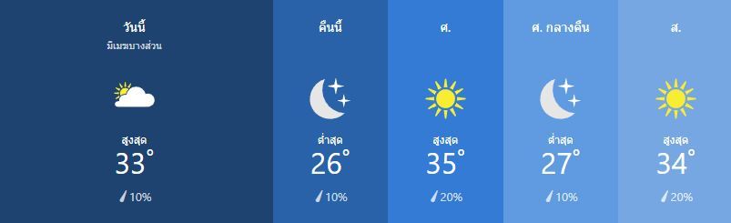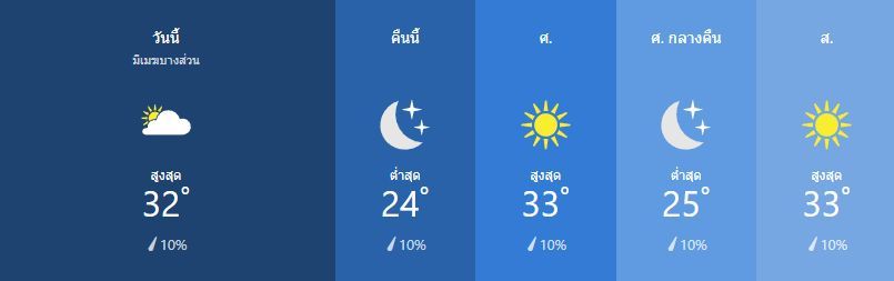 มีเมฆมากเป็นบางส่วน สูง 33เซลเซียส ความเร็วลม ใต้ ที่ 10 ถึง 15 กิโลเมตรต่อชั่วโมง
