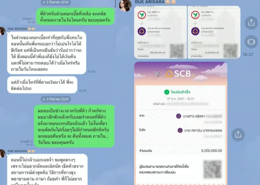 ในรายการ ซุง ศตาวิน ได้เปิดหลักฐานแชตให้ดูว่า ดิว อริสรา ได้พูดคุยกับตนและรุ่นพี่อีกคน เพื่อผ่อนปรนการใช้หนี้รวม 20 ล้านบาท จากวันที่ 23 กรกฎาคม 2567 มาจนถึง 6 สิงหาคม 2567 แต่ก็ยังหาเงินมาใช้ไม่ได้ ซุง ศตาวินจึงขีดเส้นตายว่าต้องได้เงินคืนภายในวันนี้เท่านั้น เพราะเลื่อนให้หลายครั้งแล้ว