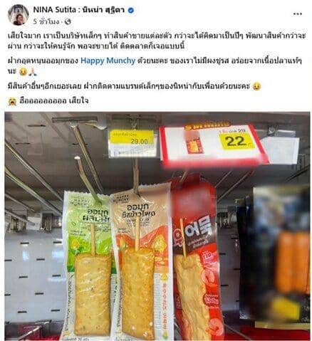 “ฝากอุดหนุนออมุกของ Happy Munchy ด้วยนะคะ ของเราไม่มีผงชูรส อร่อยจากเนื้อปลาแท้ ๆ นะ มีสินค้าอื่น ๆ อีกเยอะเลย ฝากติดตามแบรนด์เล็ก ๆ ของนิหน่ากับเพื่อนด้วยนะคะ ฮือออออออออ เสียใจ”
