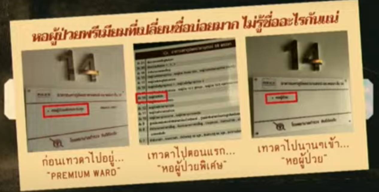 พร้อมกันนี้ยังเปิดหลักฐานถึงชั้น 14 เรื่องพรีเมี่ยมวอร์ดอีกด้วย หลังจากที่ชั้น 14 ตกเป็นเป้าว่านายใหญ่เข้าไปอยู่ได้อย่างไร โรงพยาบาลตำรวจแก้ปัญหาโดยการเปลี่ยนชื่อจากเดิมชื่อ หอผู้ป่วยพิเศษระดับสูง เปลี่ยนเป็นหอผู้ป่วย อันนี้ให้ไปถ่ายรูปบางจุดยังเป็นหอพิเศษระดับสูง หลังจากนั้นแม้จะอยู่ห้องเดิม แต่ไม่ได้อยู่หอผู้ป่วยพิเศษระดับสูง เพราะเปลี่ยนชื่อแล้ว การที่นายใหญ่ได้รับการดูแลดีขนาดนี้เพราะดีลปีศาจใช่ไหม?