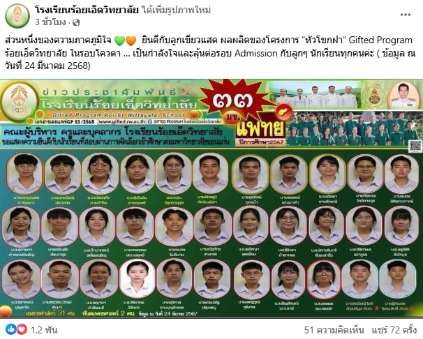 “ส่วนหนึ่งของความภาคภูมิใจ ยินดีกับลูกเขียวแสด ผลผลิตของโครงการ “หัวโขกฝา” Gifted Program ร้อยเอ็ดวิทยาลัย ในรอบโควตา … เป็นกำลังใจและลุ้นต่อรอบ Admission กับลูกๆ นักเรียนทุกคนค่ะ ( ข้อมูล ณ วันที่ 24 มีนาคม 2568)”