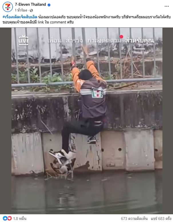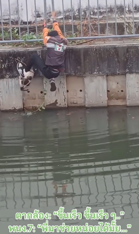 โซเชียลแห่ชื่นชม พนักงานเซเว่น โหนตัวกับรั้วกั้นข้างคลอง ช่วยชีวิตแมวตกน้ำ บริษัทต้นสังกัดทราบเรื่องแล้ว เตรียมมอบรางวัลเชิดชูเกียรติ