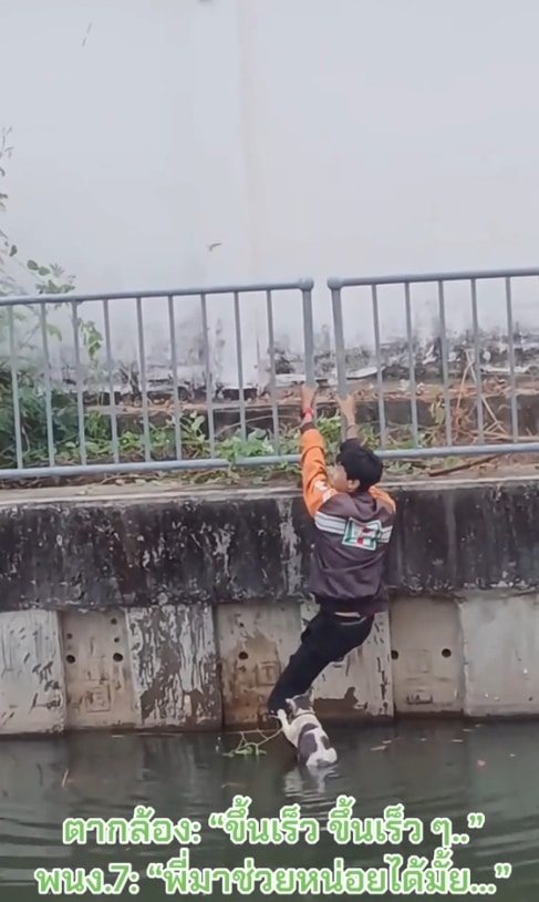 สุดท้าย ฮีโร่หนุ่มรายนี้ จึงตัดสินใจโหนตัวเองด้วยการจับราวกั้นคลองเอาไว้ และถ่วงตัวเองลงไป โดยเอาขาข้างหนึ่งหย่อนลงในน้ำคลองอย่างไม่สนใจว่ารองเท้า กับกางเกงจะเลอะน้ำเน่า แต่เขากลับคิดแค่เพียงว่าจะต้องช่วยแมวตัวนี้ขึ้นมาจากน้ำให้ได้ก่อนที่คลิปจะตัดไป