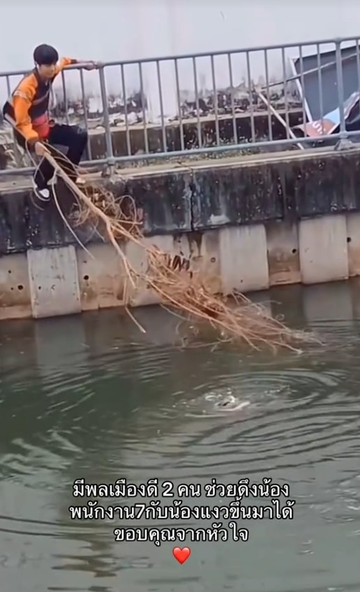 สุดท้าย ฮีโร่หนุ่มรายนี้ จึงตัดสินใจโหนตัวเองด้วยการจับราวกั้นคลองเอาไว้ และถ่วงตัวเองลงไป โดยเอาขาข้างหนึ่งหย่อนลงในน้ำคลองอย่างไม่สนใจว่ารองเท้า กับกางเกงจะเลอะน้ำเน่า แต่เขากลับคิดแค่เพียงว่าจะต้องช่วยแมวตัวนี้ขึ้นมาจากน้ำให้ได้ก่อนที่คลิปจะตัดไป