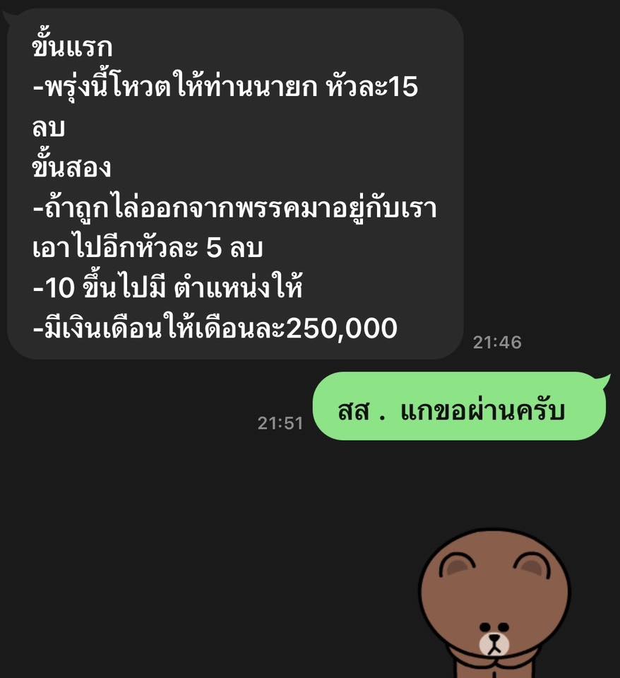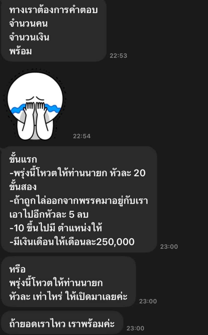 เมื่อ 6.00 น. วันนี้ก็มีภาพแคปไลน์ที่ผู้เสนอเงินคุยกับ(นายB) มาถึงผม เพิ่มยอดเป็น 20 ล้าน ถ้าย้ายพรรคให้อีก 5 ล้าน ถ้ามา 10 คนมีตำแหน่งให้ และให้เงินเดือนอีก 250,000 บาท