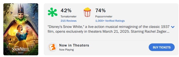 แม้ว่า สโนว์ไวท์ 2025 จะทำรายได้เปิดตัวแซงหน้า Ne Zha 2 อนิเมชันจากจีนที่ครองแชมป์ Box Office มานานถึง 8 สัปดาห์ได้ แต่หากมองดูตัวเลขรายได้รวม ต้องบอกเลยว่าดิสนีย์กำลังจะได้หนังเจ๊งเข้าไปสะสมในคอลเล็กชันอีกหนึ่งเรื่องแล้ว เพราะนี่คือหนังที่ทำรายได้เปิดตัวต่ำสุดของดิสนีย์ และยังเป็นหนึ่งที่ได้รับเสียงวิจารณ์ที่ค่อนข้างแย่ จนหลายคนยกว่านี่อาจจะห่วยเสียยิ่งกว่า Dragonball Evolution เสียอีก