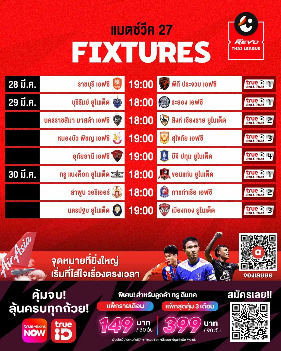 ตารางแข่งขัน รีโว่ 2024/25 ไทยลีก โปรแกรมฟุตบอลไทยลีก นัดที่ 27 ทุกคู่ถ่ายทอดสดทาง AIS Play และ True Ball Thai