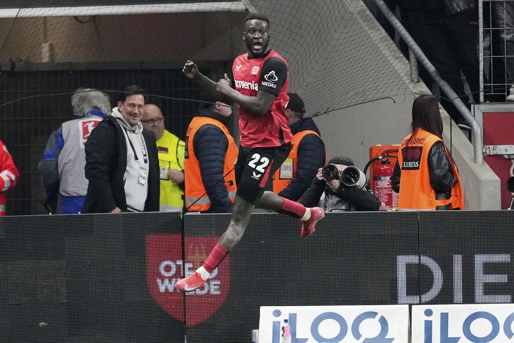 Leverkusen’s Amine Adli is celebrated after scoring his side’s third goal during the German Bundesliga soccer match between Bayer Leverkusen and VfL Bochum at the BayArena in Leverkusen, Germany, Friday, March 28, 2025. (AP Photo/Martin Meissner)