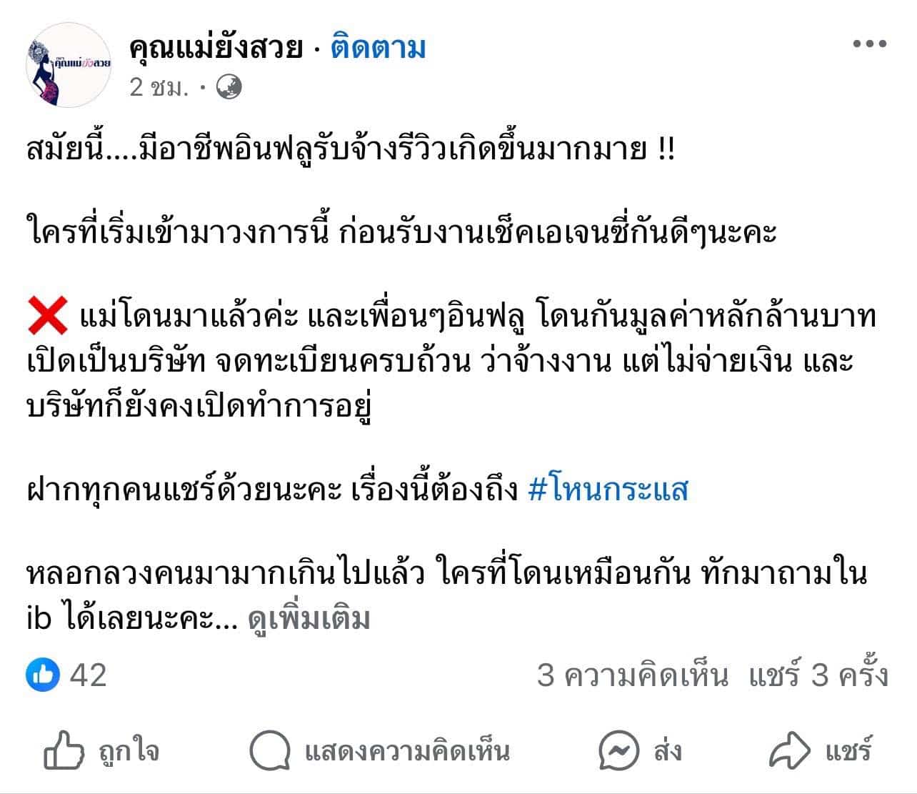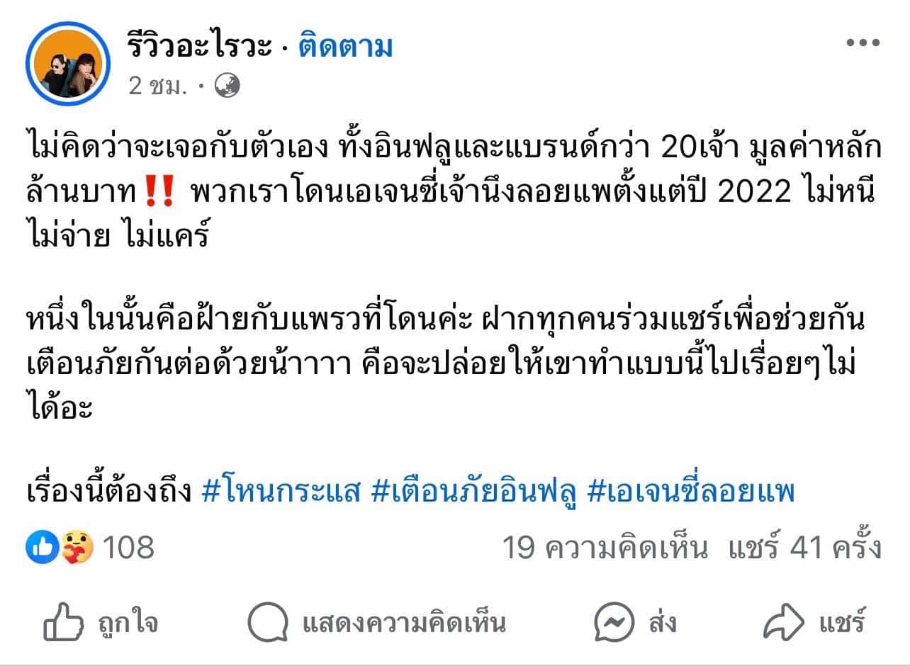 ดารา อินฟลู ครึ่งวงการยังไม่รอด แฉกลโกง เอเจนซี่ดัง ย่านลาดพร้าว เบี้ยวเงินอินฟลูฯ-แบรนด์ เสียหายนับสิบล้าน ล่าสุดคนดังแห่ร้อง “กัน จอมพลัง”