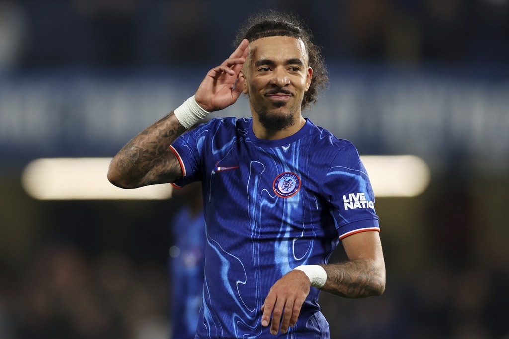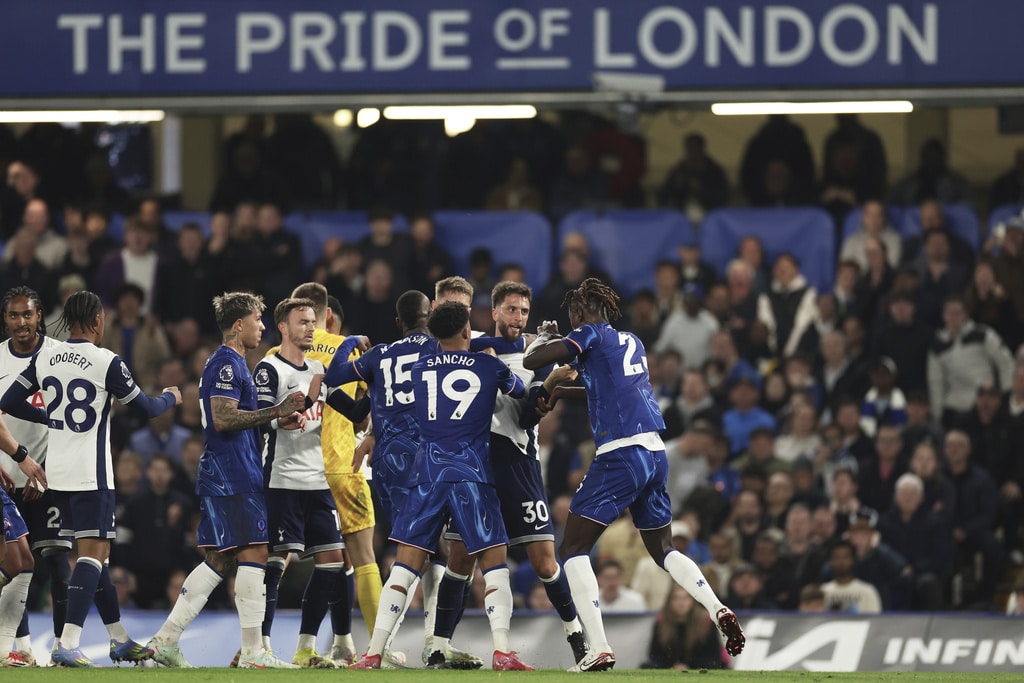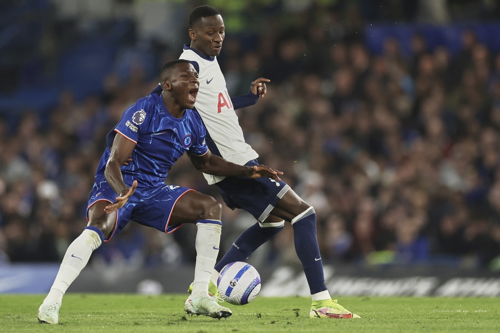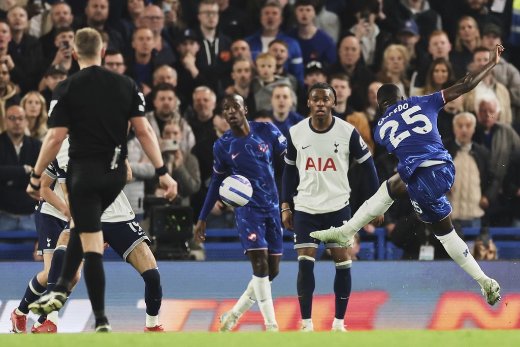 Chelsea’s Malo Gusto kicks the ball during the English Premier League soccer match between Chelsea and Tottenham Hotspur, at Stamford Bridge stadium, in London, Thursday, April 3, 2025. (AP Photo/Ian Walton)Chelsea’s Moises Caicedo shoots the ball during the English Premier League soccer match between Chelsea and Tottenham Hotspur, at Stamford Bridge stadium, in London, Thursday, April 3, 2025. (AP Photo/Ian Walton)Tottenham’s Pape Matar Sarr, rear, and Chelsea’s Moises Caicedo vie for the ball during the English Premier League soccer match between Chelsea and Tottenham Hotspur, at Stamford Bridge stadium, in London, Thursday, April 3, 2025. (AP Photo/Ian Walton)Chelsea’s Malo Gusto celebrates after the end of the English Premier League soccer match between Chelsea and Tottenham Hotspur, at Stamford Bridge stadium, in London, Thursday, April 3, 2025. (AP Photo/Ian Walton)Tottenham’s Rodrigo Bentancur, center, clashes with Chelsea’s Trevoh Chalobah, right, during the English Premier League soccer match between Chelsea and Tottenham Hotspur, at Stamford Bridge stadium, in London, Thursday, April 3, 2025. (AP Photo/Ian Walton)