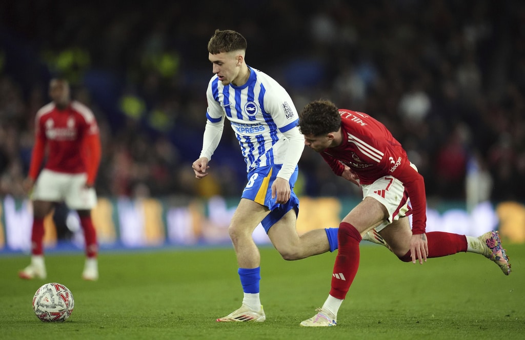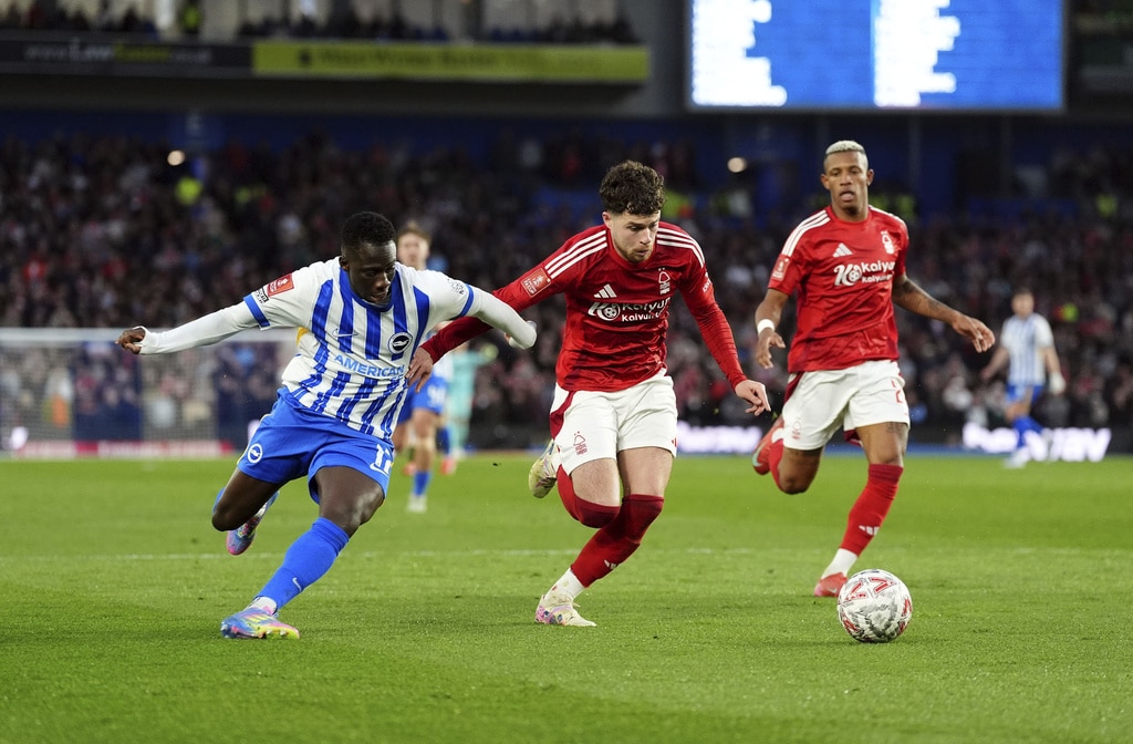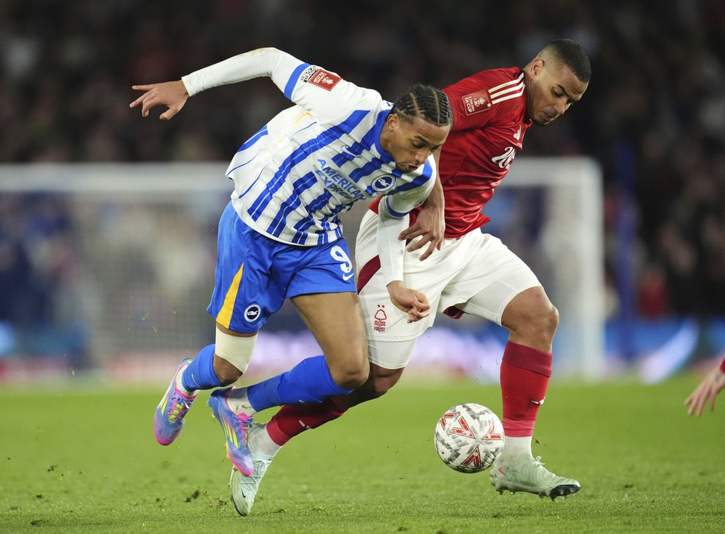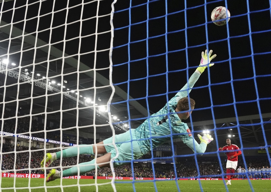 Brighton and Hove Albion’s Yankuba Minteh, left and Nottingham Forest’s Neco Williams vie for the ball, during the English FA Cup quarter final soccer match between Brighton and Hove Albion and Nottingham Forrest, at the Amex Stadium, in Brighton and Hove, England, Saturday, March 29, 2025. (Adam Davy/PA via AP)Nottingham Forest’s Callum Hudson-Odoi scores a penalty in the shoot-out following the English FA Cup quarter final soccer match between Brighton and Hove Albion and Nottingham Forrest, at the Amex Stadium, in Brighton and Hove, England, Saturday, March 29, 2025. (Adam Davy/PA via AP)Brighton and Hove Albion’s Joao Pedro, left and Nottingham Forest’s Murillo vie for the ball, during the English FA Cup quarter final soccer match between Brighton and Hove Albion and Nottingham Forrest, at the Amex Stadium, in Brighton and Hove, England, Saturday, March 29, 2025. (Adam Davy/PA via AP)Brighton and Hove Albion’s Brajan Gruda, center and Nottingham Forest’s Neco Williams vie for the ball, during the English FA Cup quarter final soccer match between Brighton and Hove Albion and Nottingham Forrest, at the Amex Stadium, in Brighton and Hove, England, Saturday, March 29, 2025. (Adam Davy/PA via AP)