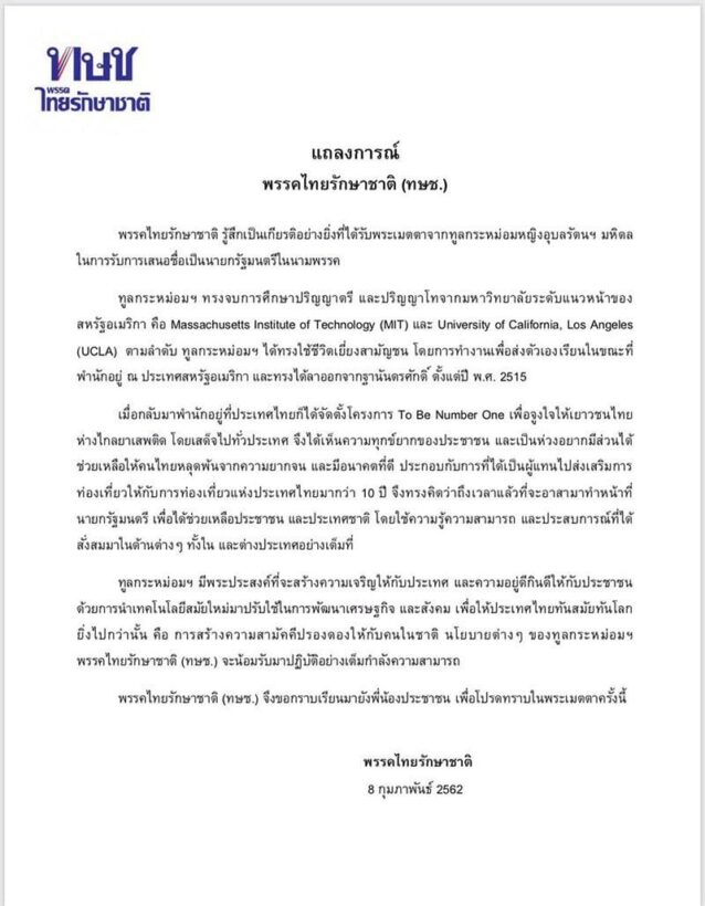 พรรคไทยรักษาชาติ ออกหนังสือแถลงการณ์ หลังเสนอชื่อทูลกระหม่อมหญิงอุบลรัตนฯ ลงชิงตำแหน่งนายก