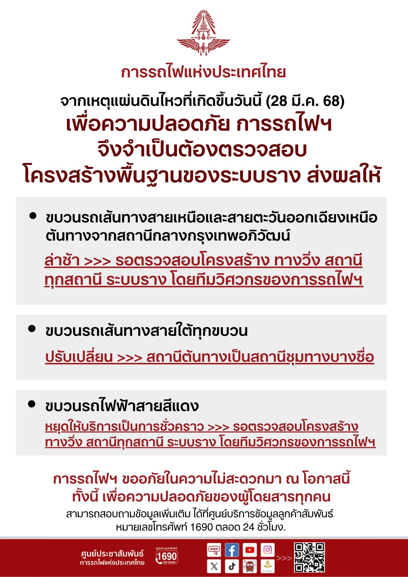 จากเหตุแผ่นดินไหวที่เกิดขึ้นวันนี้ เพื่อความปลอดภัย การรถไฟฯ จึงจำเป็นต้องตรวจสอบโครงสร้างพื้นฐานของระบบราง ส่งผลให้