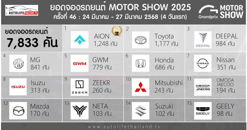 - Motor Show 2025 ยอดจองรถยนต์ 4 วันแรก (24 – 27 มี.ค. 68) : 7,833 คัน