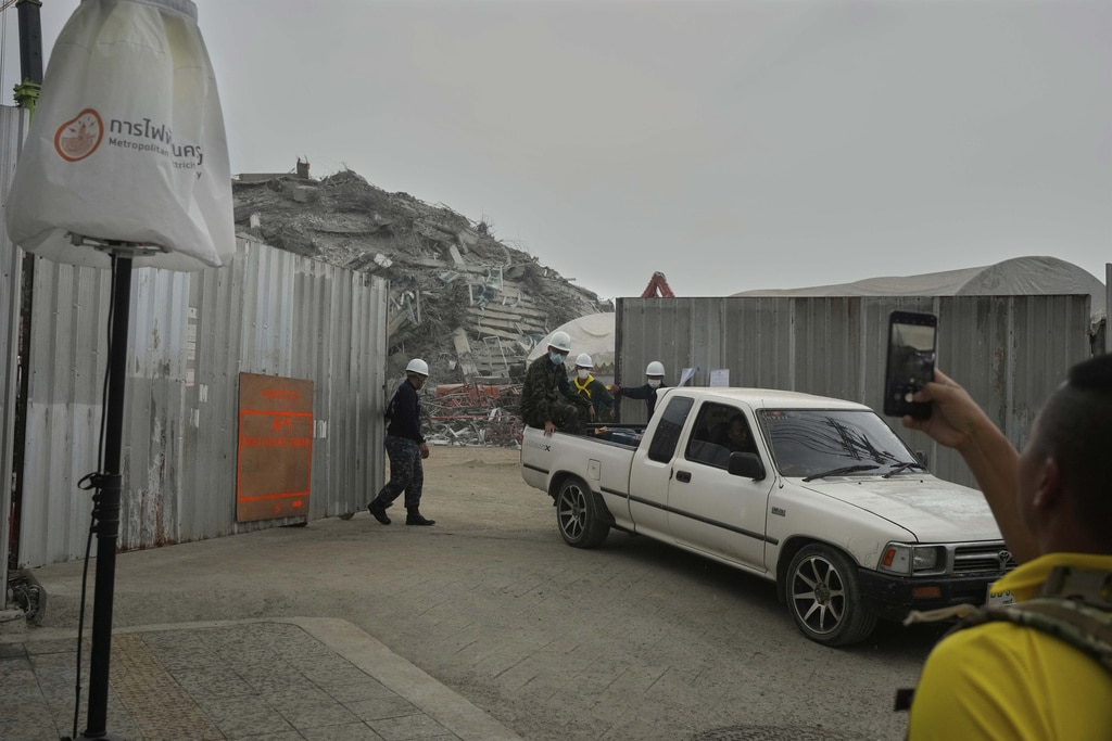 A rescuer vehicle comes out after working overnight at the site of an under-construction high-rise building that collapsed after an earthquake in Bangkok, Thailand, Monday, March 31, 2025. (AP Photo/Manish Swarup)