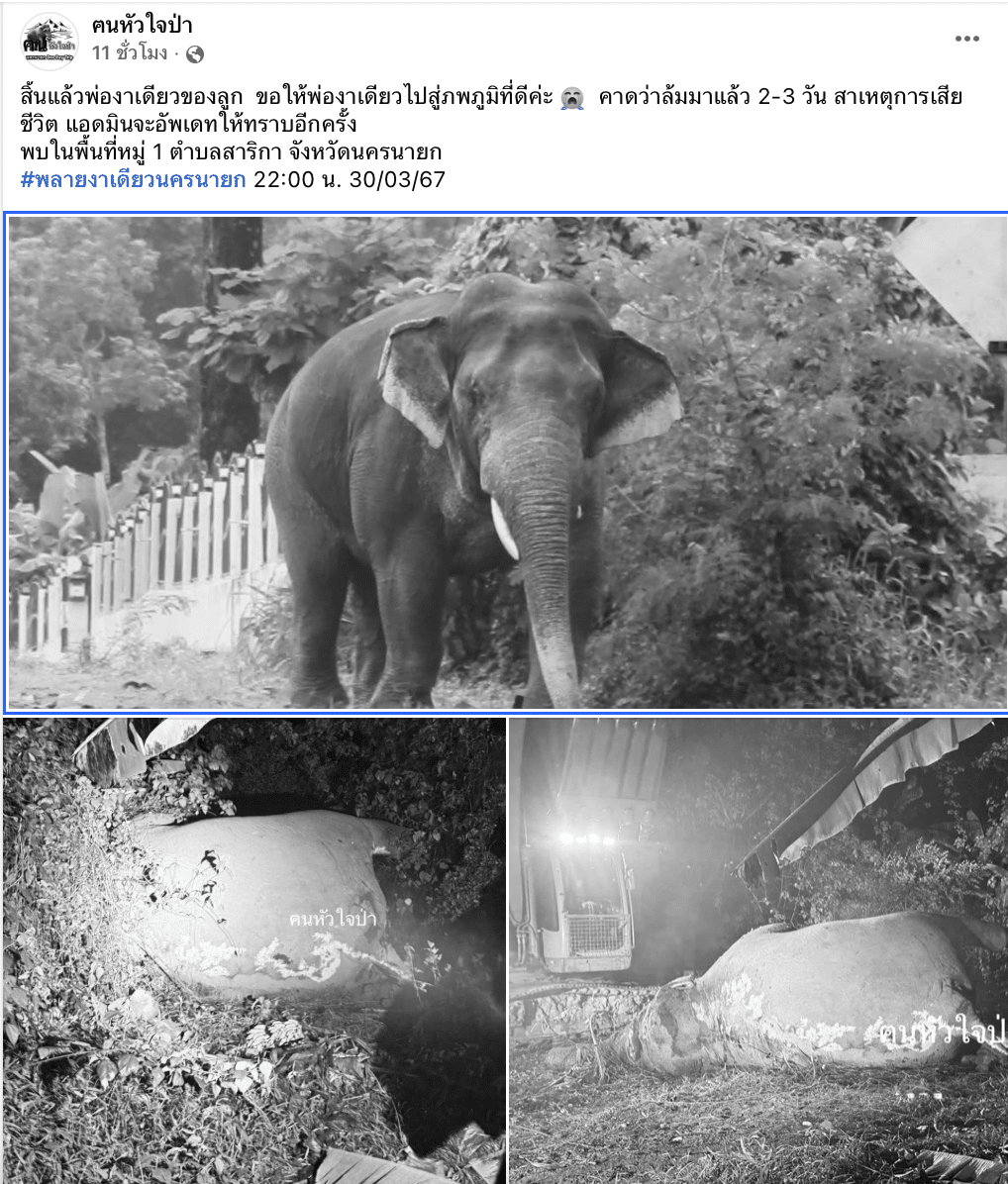 สิ้นแล้ว “พลายงาเดียว” ช้างป่านครนายก หลังช่วยชีวิตจากบ่วงรัดเพียง 7 วัน