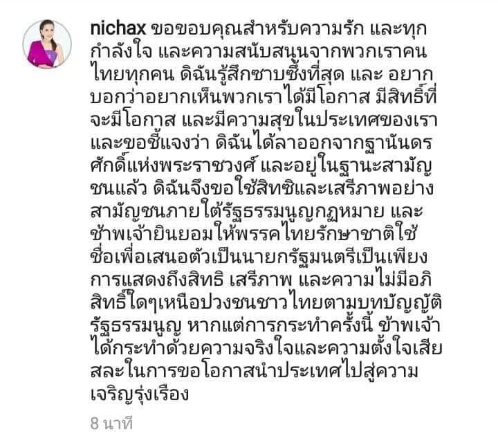 “ขอขอบคุณสำหรับความรัก และทุกกำลังใจ และความสนับสนุนจากพวกเราคนไทยทุกคน ดิฉันรู้สึกซาบซึ้งที่สุด และอยากบอกว่าอยากเห็นพวกเราได้มีโอกาส มีสิทธิ์ที่จะมีโอกาส และมีความสุขในประเทศของเรา และขอชี้แจงว่า ดิฉันได้ลาออกจากฐานันดรศักดิ์แห่งพระราชวงศ์ และอยู่ในฐานะสามัญชนแล้ว ดิฉันจึงขอใช้สิทธิ์และเสรีภาพอย่างสามัญชนภายใต้รัฐธรรมนูญกฎหมาย และข้าพเจ้ายินยอมให้พรรคไทยรักษาชาติใช้ชื่อเพื่อเสนอตัวเป็นนายกรัฐมนตรีเป็นเพียงการแสดงถึงสิทธิ เสรีภาพ และความไม่มีอภิสิทธิ์์ใดๆเหนือปวงชนชาวไทยตามบทบัญญัติรัฐธรรมนูญ หากแต่การกระทำครั้งนี้ ข้าพเจ้าได้กระทำด้วยความจริงใจและความตั้งใจเสียสละในการขอโอกาสนำประเทศไปสู่ความเจริญรุ่งเรือง”