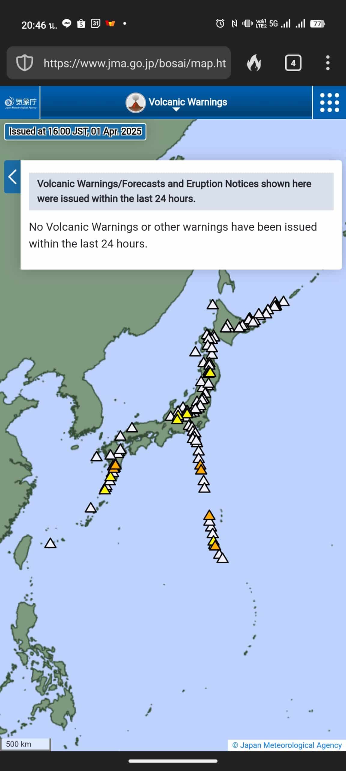 อย่างไรก็ดี ทีมข่าวไทยเกอร์ ตรวจสอบกับกรมอุตุนิยมวิทยาญี่ปุ่น ล่าสุด 1 เมษายน 2568 เวลา 20:45 น ไม่มีการแจ้งเตือนภูเขาไฟอย่างน้อย 24 ชั่วโมงหลังสุด