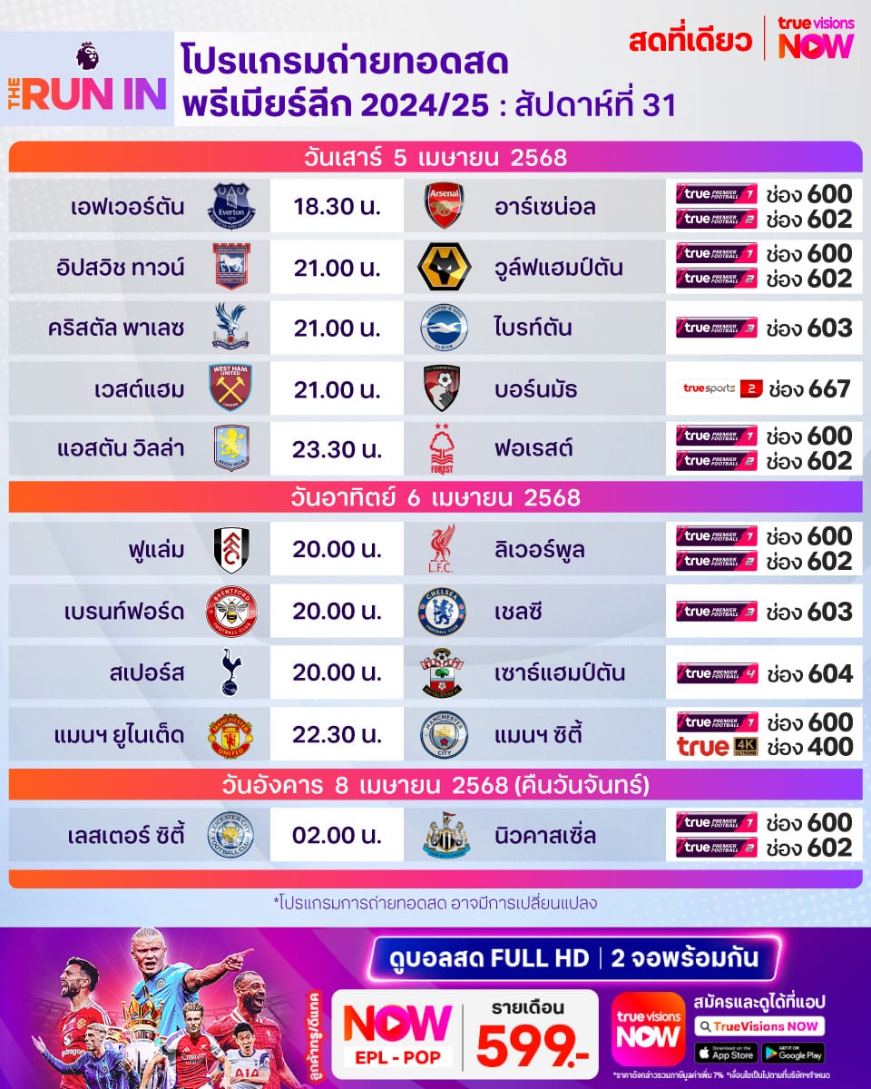 โปรแกรมพรีเมียร์ลีก 2024/25 สัปดาห์ที่ 31 แข่งวันที่ 5-7 เม.ย. นี้ ตารางแข่งพร้อมช่องดูบอลสด