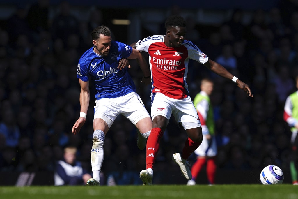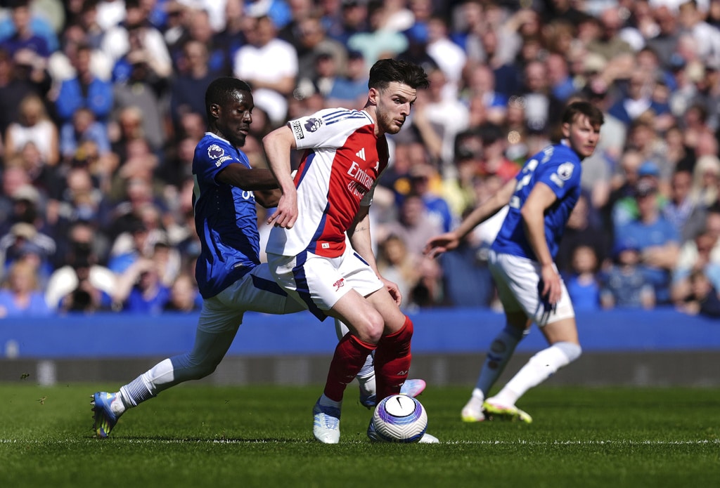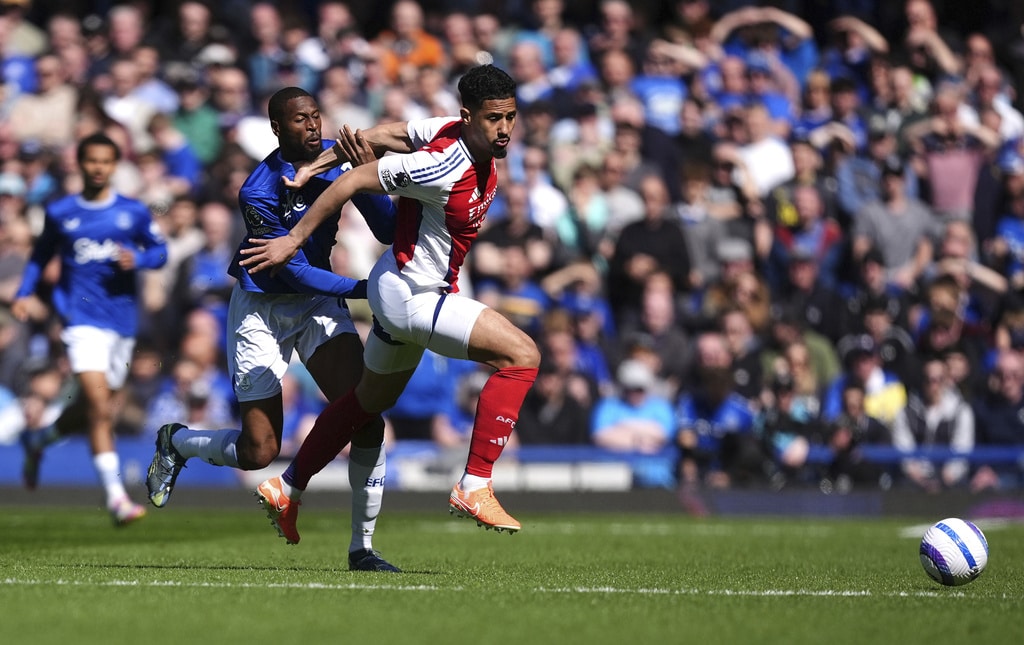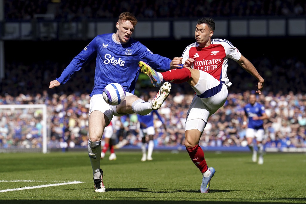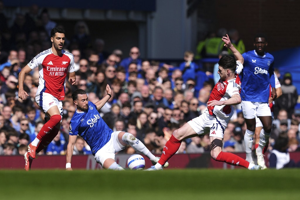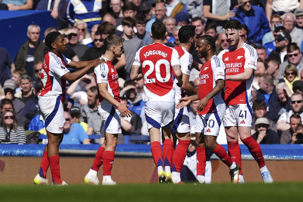 Everton’s Beto, left, and Arsenal’s William Saliba battle for the ball during the English Premier League soccer match between Everton and Arsenal at Goodison Park, Liverpool, England, Saturday, April 5, 2025. (Martin Rickett/PA via AP)Everton’s Jake O’Brien, left, and Arsenal’s Gabriel Martinelli battle for the ball during the English Premier League soccer match between Everton and Arsenal at Goodison Park, Liverpool, England, Saturday, April 5, 2025. (Martin Rickett/PA via AP)Everton’s Jack Harrison, left, and Arsenal’s Bukayo Saka battle for the ball during the English Premier League soccer match between Everton and Arsenal at Goodison Park, Liverpool, England, Saturday, April 5, 2025. (Martin Rickett/PA via AP)Arsenal’s Leandro Trossard, second left, celebrates scoring their side’s first goal of the game during the English Premier League soccer match between Everton and Arsenal at Goodison Park, Liverpool, England, Saturday, April 5, 2025. (Martin Rickett/PA via AP)Everton’s Idrissa Gueye, left, and Arsenal’s Declan Rice battle for the ball during the English Premier League soccer match between Everton and Arsenal at Goodison Park, Liverpool, England, Saturday, April 5, 2025. (Martin Rickett/PA via AP)Everton’s Jack Harrison, left, and Arsenal’s Declan Rice battle for the ball during the English Premier League soccer match between Everton and Arsenal at Goodison Park, Liverpool, England, Saturday, April 5, 2025. (Martin Rickett/PA via AP)