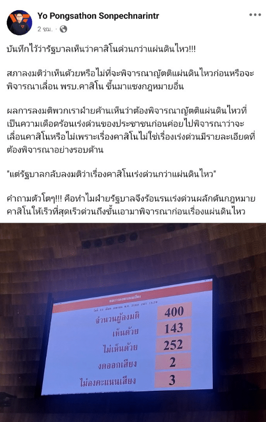 ผลการลงมติพวกเราฝ่ายค้านเห็นว่าต้องพิจารณาญัตติแผ่นดินไหวที่เป็นความเดือดร้อนเร่งด่วนของประชาชนก่อนค่อยไปพิจารณาว่าจะเลื่อนคาสิโนหรือไม่เพราะเรื่องคาสิโนไม่ใช่เรื่องเร่งด่วนมีรายละเอียดที่ต้องพิจารณาอย่างรอบด้าน