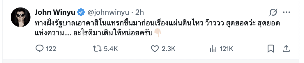 ด้าน จอร์น วิญญู นักวิจารณ์การเมืองชื่อดัง กล่าวแสดงความผิดหวังว่า ทางฝั่งรัฐบาลเอาคาสิโนแทรกขึ้นมาก่อนเรื่องแผ่นดินไหว ว้าววว สุดยอดว่ะ สุดยอดแห่งความ…. อะไรดีมาเติมให้หน่อยครับ
