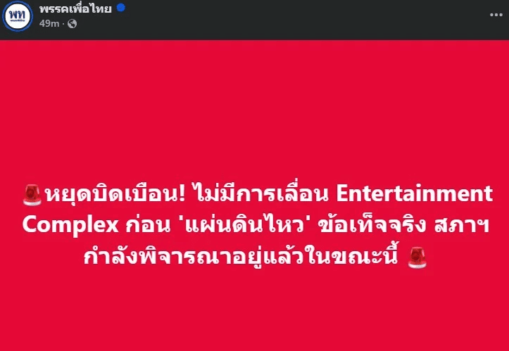 พรรคเพื่อไทยยืนยันว่า “ไม่มีการเลื่อน Entertainment Complex ก่อนแผ่นดินไหว” ขอชี้แจงข้อเท็จจริงเพื่อให้เกิดความเข้าใจที่ถูกต้องว่า การเสนอให้นำร่างกฎหมายสถานบันเทิง และร่าง พ.ร.บ.เสริมสร้างสันติสุข (นิรโทษกรรม) ขึ้นพิจารณาในสภานั้น มีเป้าหมายชัดเจนเพื่อบรรจุเข้าสู่วาระใน “สัปดาห์หน้า” คือวันที่ 9 เมษายน 2568 ไม่ใช่การหยิบขึ้นถกในทันทีแต่อย่างใด