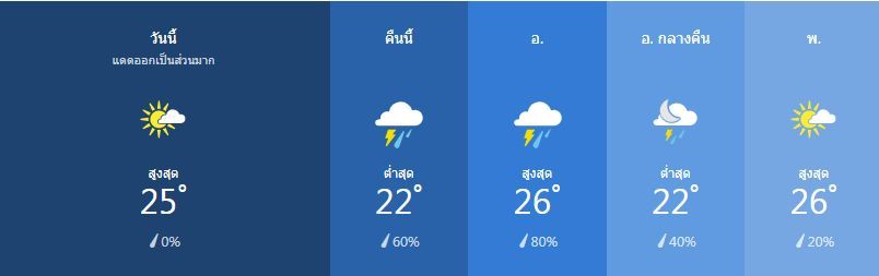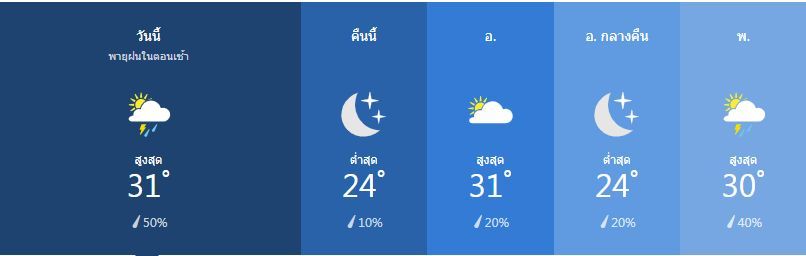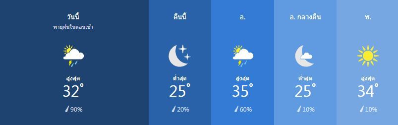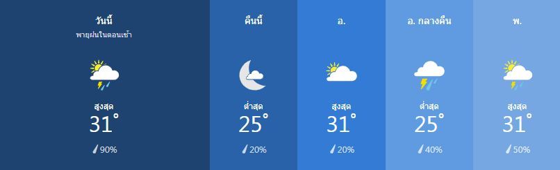มีพายุฟ้าคะนองในตอนเช้า สูง 32เซลเซียส ความเร็วลม ใต้ ที่ 10 ถึง 15 กิโลเมตรต่อชั่วโมง โอกาสที่ฝนจะตก 90%