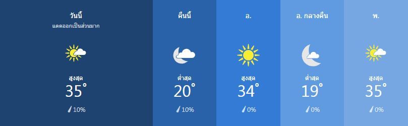 ท้องฟ้าแจ่มใสมาก สูง 35เซลเซียส ความเร็วลม ตะวันออก ตะวันออกเฉียงใต้ ที่ 10 ถึง 15 กิโลเมตรต่อชั่วโมง