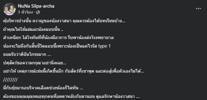 “ถ้าคุณไม่ใช้แม่และน้องแบบนั้น ..สำเหนียก ใส่ใจทันทีที่น้องมีอาการ รีบพาน้องส่งโรงพยาบาล น้องจะไม่ถึงกับสิ้นชีวิตแบบนี้เพราะน้องเป็นแค่ไวรัส type 1 ยอมรับว่าดิฉันโกรธมาก …ปศุสัตว์ขอความกรุณาอย่านิ่งเฉย…อย่าให้ เหตุการณ์เช่นนี้เกิดขึ้นอีก กับสัตว์ที่เขาพูด และต่อสู้เพื่อตัวเองไม่ได้…”