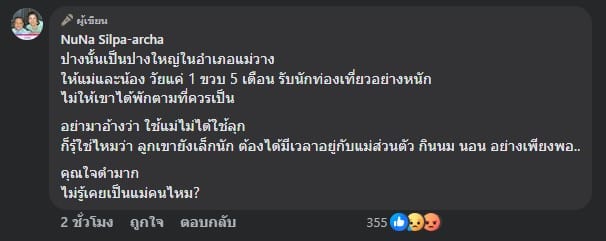 “อย่ามาอ้างว่า ใช้แม่ไม่ได้ใช้ลุก ก็รุ้ใช่ไหมว่า ลูกเขายังเล็กนัก ต้องได้มีเวลาอยู่กับแม่ส่วนตัว กินนม นอน อย่างเพียงพอ..”