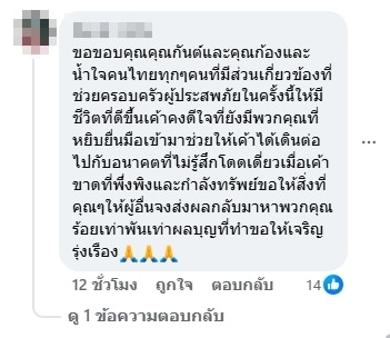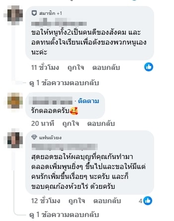 ต่อมาในเพจเฟซบุ๊ก กันจอมพลังช่วยสู้ ก็ได้มีการโพสต์ภาพรวมพร้อมบอกเล่าเรื่องราวอันน่ายินดีนี้ให้กับแฟนเพจได้ทราบ โดยระบุข้อความประกอบว่า “มีน้อง 19 มารับเงินเยียวยาจากมูลนิธิกันจอมพลังช่วยสู้ 30000 คุณพ่อน้องเป็นร่างดำส่วนแม่น้องผ่านไป7วันยังติดอยู่ในตึก ตอนนี้น้องเหลือเพียงยายชรากับน้อง 7 ขวบ แล้วพ่อกับแม่ก็เป็นคนส่งน้องเรียน ผมอยากให้อนาคตน้องทั้ง2คนไปต่อได้มูลนิธิกันจอมพลังจอมพลังช่วยสู้จึงรับส่งเสียน้องน้อง 19 และ 7 ขวบเรียนหนังสือจนจบปริญญาตรี ส่วนพี่ก้องห้วยไร่รับน้องเป็นลูกทิศทางอนาคตของน้องต้องฝากพี่ก้องแล้วครับ” ท่ามกลางคอมเมนต์ของชาวเน็ตที่ต่างก็เข้ามาชื่นชมกับน้ำใจอันยิ่งใหญ่นี้ของก้อง ห้วยไร่ และกันจอมพลัง