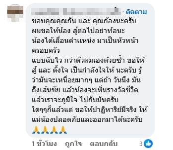 ด้าน ก้อง ห้วยไร่ ก็ได้พูดให้กำลังใจกับเด็กสาว 19 ก่อนจะตัดสินใจขอรับเป็นลูกเพื่อดูแลชีวิตหลังจากนี้ทั้งเรื่องเรียน และเรื่องอื่น ๆ โดยลูกทุ่งดังกล่าวกับน้องว่า “จะรังเกียจไหม ถ้าพี่ก้องขอเป็นพ่อกับแม่ อยากดูแลหนู มาเป็นลูกพี่ก้องไหม พี่ก้องขอเป็นอีกหนึ่งกำลังใจ ขอให้น้องมีชีวิตที่ดีแล้วก็เข้มแข็งเพื่อดูแลสังคมนี้ต่อ เป็นลูกสาวพี่ก้องนะ แล้วก็ตั้งใจเรียน แล้วก็สู้ต่อกับโลกใบนี้” พร้อมเรียกภรรยาคนสวย เบล ขนิษฐา เข้ามากอดลูกสาวและพูดต่อว่า “เข้มแข็งนะลูกนะ พ่อกับแม่อาจไม่ได้ให้อะไรมากมาย แต่ว่าพ่อกับแม่ให้ด้วยความรักด้วยบริสุทธิ์ แม่เบลล์ด้วย เรื่องอื่นไม่ต้องเป็นห่วง ไม่ต้องกังวล”