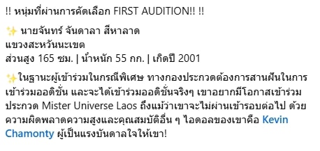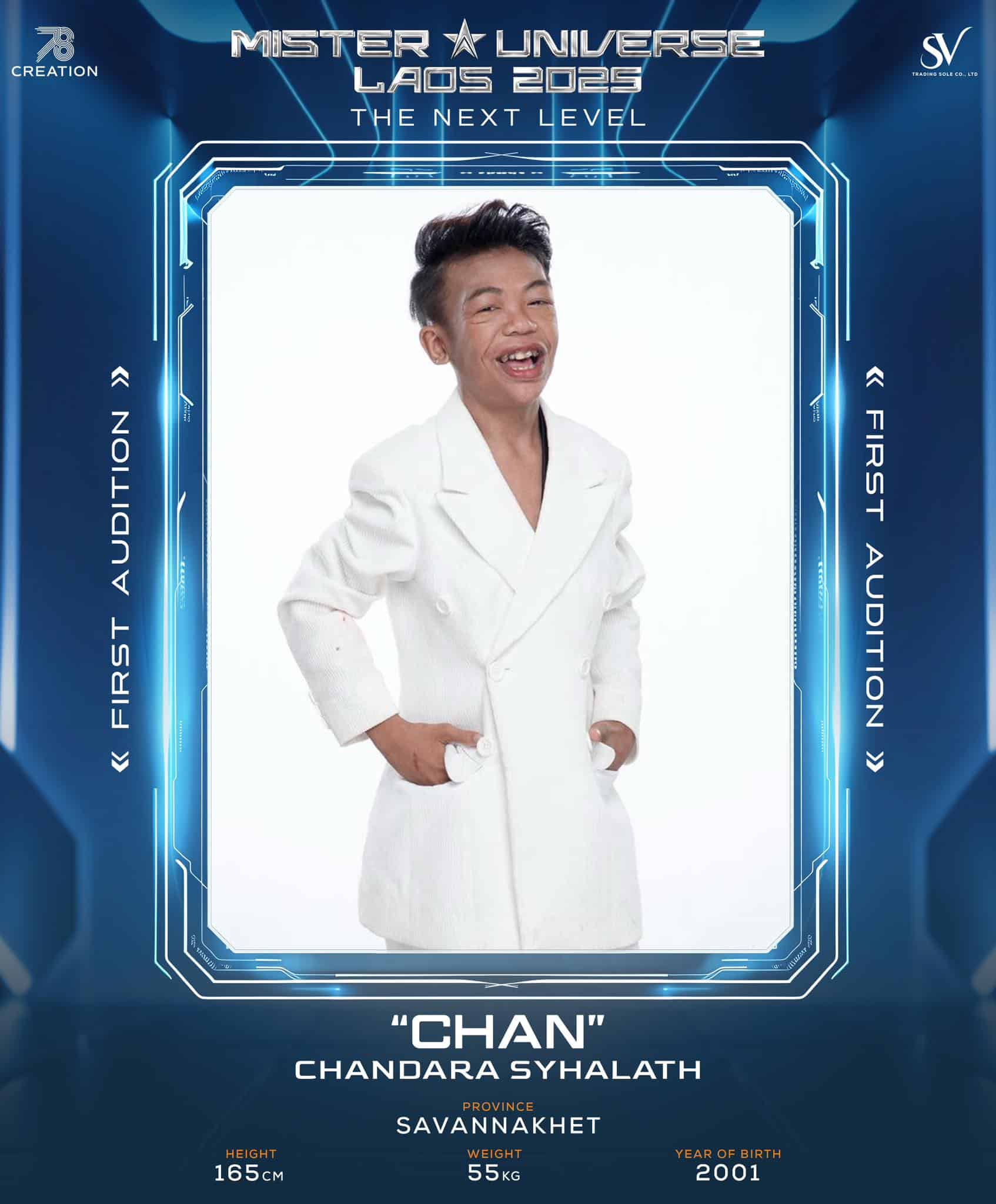 ในฐานะผู้เข้าร่วมในกรณีพิเศษ ทางกองประกวดต้องการสานฝันในการเข้าร่วมออดิชั่น และจะได้เข้าร่วมออดิชั่นจริงๆ เขาอยากมีโอกาสเข้าร่วมประกวด Mister Universe Laos ถึงแม้ว่าเขาจะไม่ผ่านเข้ารอบต่อไป ด้วยความผิดพลาดความสูงและคุณสมบัติอื่น ๆ ไอดอลของเขาคือ Kevin Chamonty ผู้เป็นแรงบันดาลใจให้เขา!”
