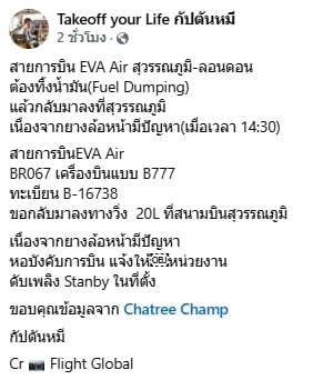 ขณะเดียวกันทางเพจเฟซบุ๊ก Takeoff your Life กัปตันหมี ก็ได้มีการโพสต์รายงานเรื่องดังกล่าวเอาไว้ด้วยระบุว่า “สายการบิน EVA Air สุวรรณภูมิ-ลอนดอน ต้องทิ้งน้ำมัน(Fuel Dumping) แล้วกลับมาลงที่สุวรรณภูมิ เนื่องจากยางล้อหน้ามีปัญหา(เมื่อเวลา 14:30)